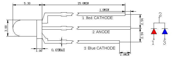 공통 음극 3mm 빨간색/파란색 원형 LED 램프