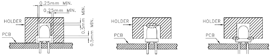 6. 납땜하는 동안 부품 커버와 홀더는 납땜하는 동안 LED에 손상을 주는 응력을 가하지 않도록 여유 공간을 두어야 합니다.