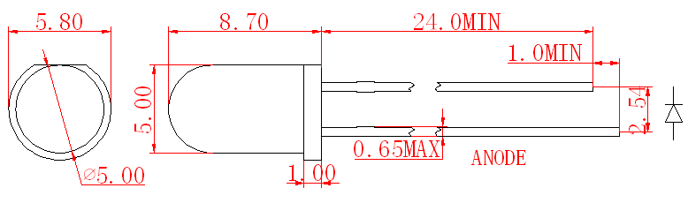 2. 별도로 명시하지 않는 한 공차는 ±0.25mm(0.01˝)입니다. 광도 허용 오차는 ±10%입니다.