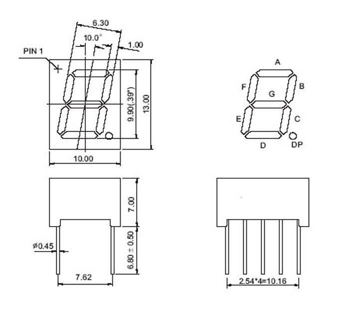 단일 자리 7 세그먼트 LED 디스플레이, 손가락 높이 : 9.90mm (0.39inch), 외형 치수 : 10.00x13.00x7.00mm (LxWxHmm) | ||||||||