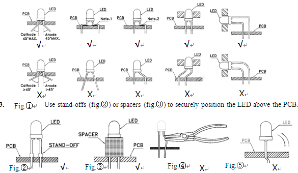 4. 리드 성형 시, 굽힘력이 LED 렌즈 및 내부 구조에 전달되지 않도록 공구나 지그를 사용하여 리드를 단단히 고정하십시오. 부품이 PCB에 실장된 후에는 리드 포밍을 수행하지 마십시오.(그림 ④)