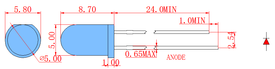 2. 허용 오차는 별도로 지정되지 않는 한 ±0.25mm입니다. 광도 허용 오차는 ±10%입니다.